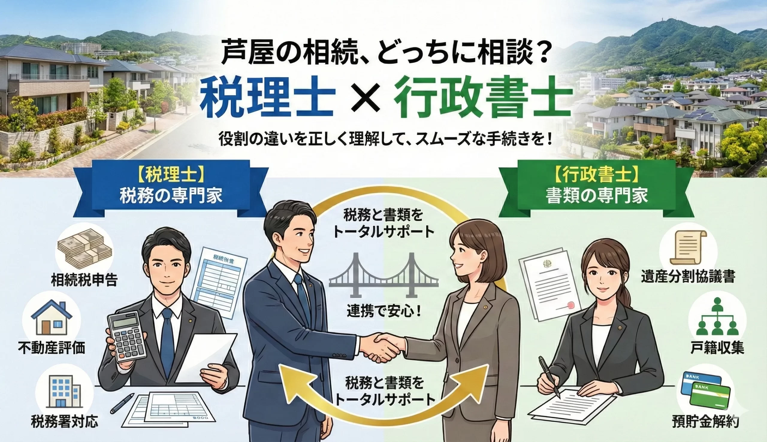 税理士と行政書士は、相続において担う役割が明確に異なる専門家です。芦屋市の相続では、税務と書類手続きの両面を正しく整理し、必要な専門家に早めに相談することが、円滑で安心な相続につながります。